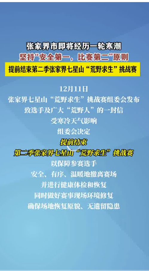 12月11日,张家界七星山“荒野求生”挑战赛组委会发布《致张家界七星山荒野求生选手及广大“荒野人”的一封信》,宣布因极端天气原因,提前结束第二季张家界七星山“荒野求生”挑战赛。